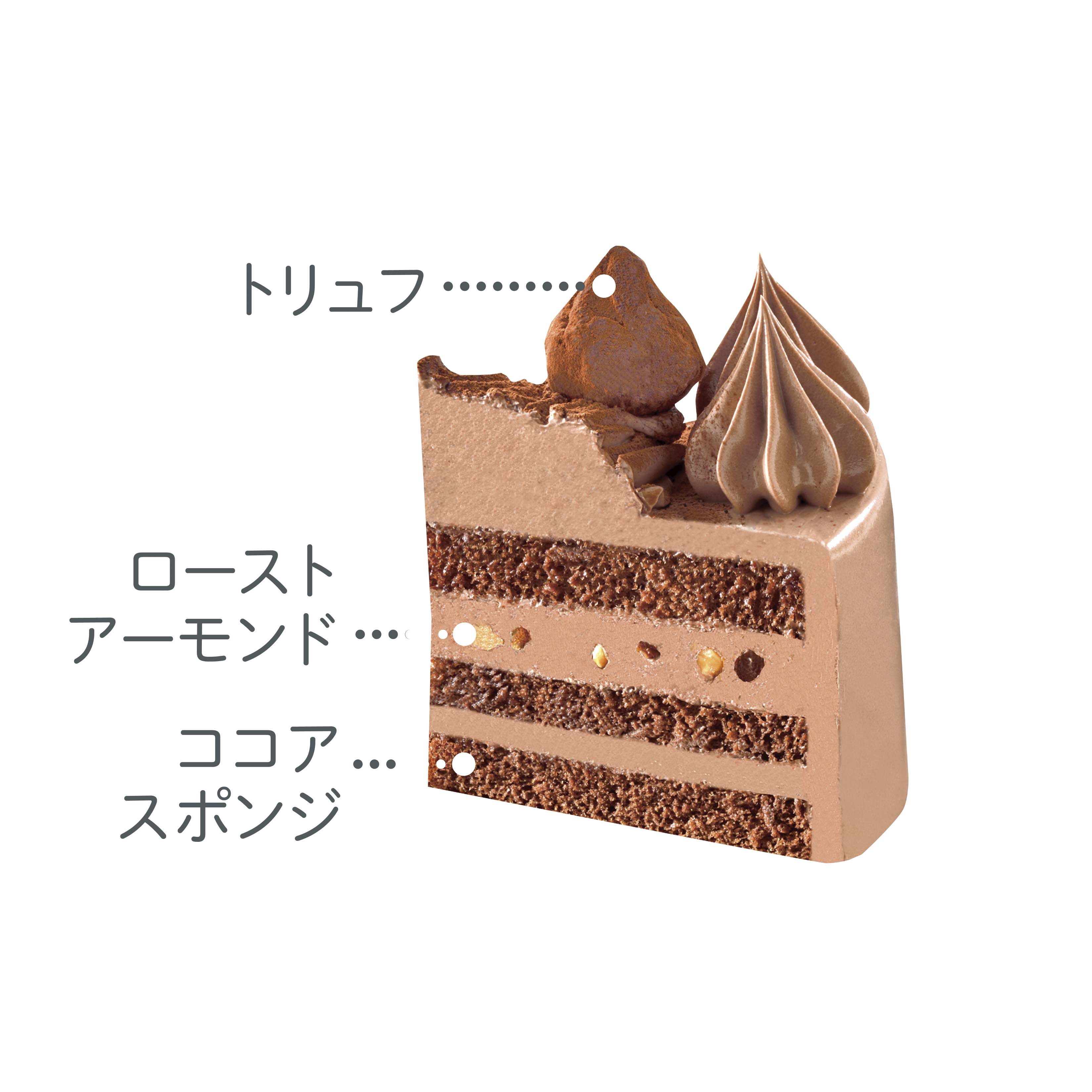 さっぱりとしたチョコクリームとアーモンドをココアスポンジでサンドした糖質を抑えたケーキです。上部にはトリュフチョコとココアパウダーをトッピングしました。