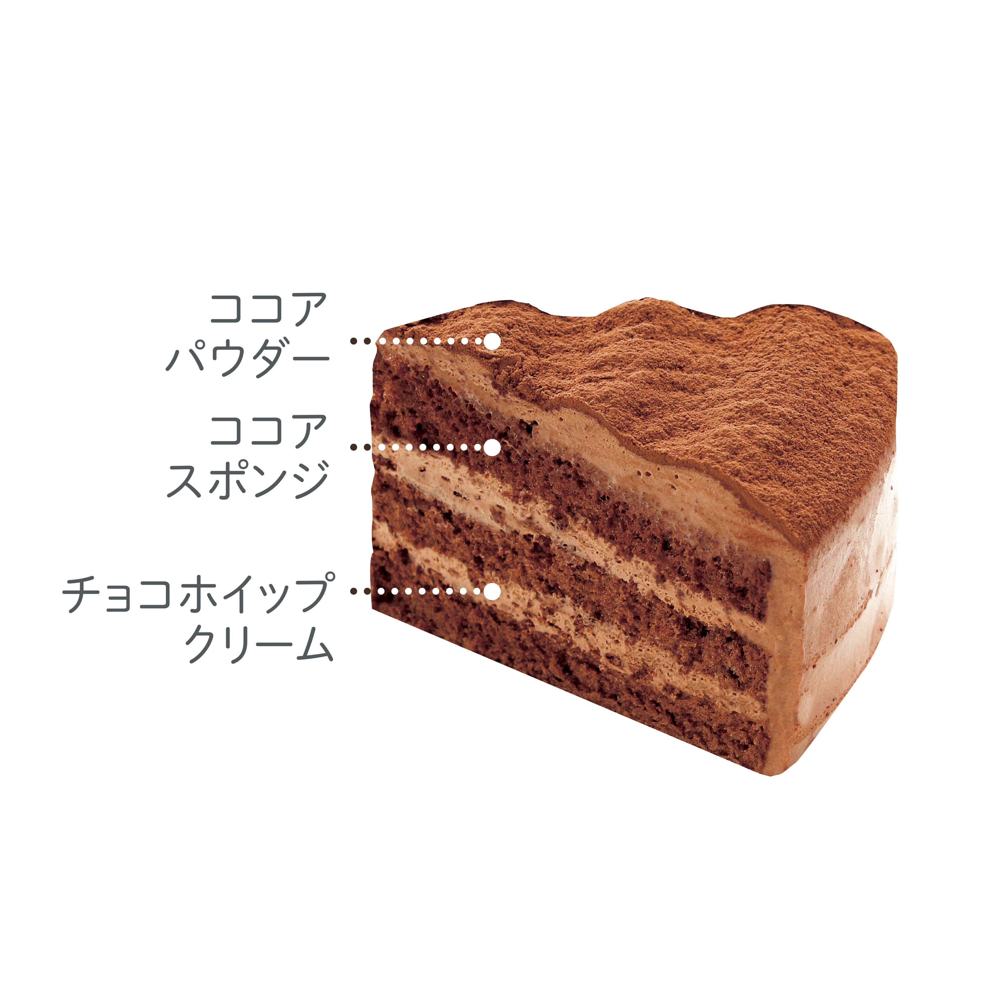 二層のチョコクリームと軽い口あたりのスポンジがバランスよく重なりまろやかな味わいに。振りかけたココアパウダーが美味しさをよりいっそう引き立てます。