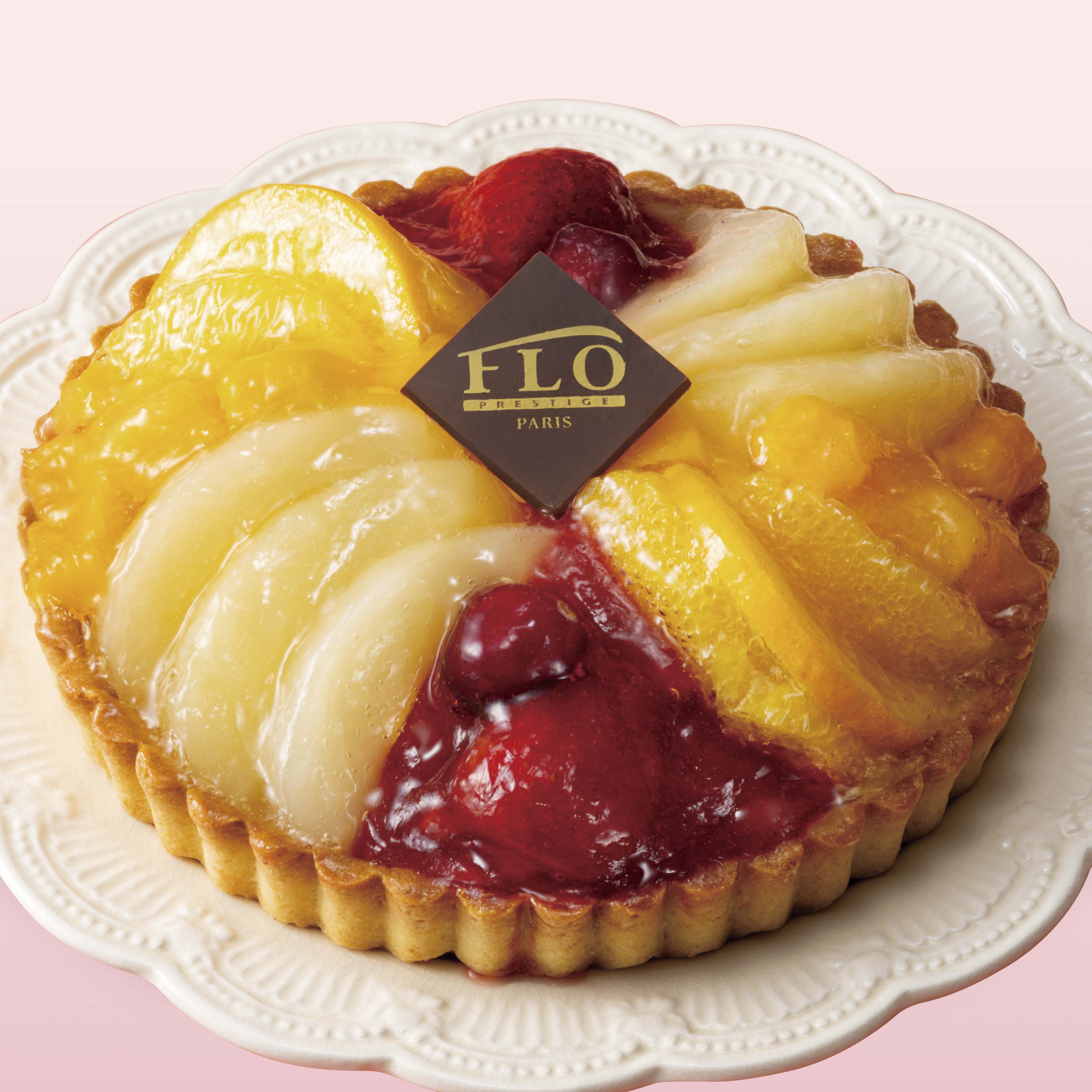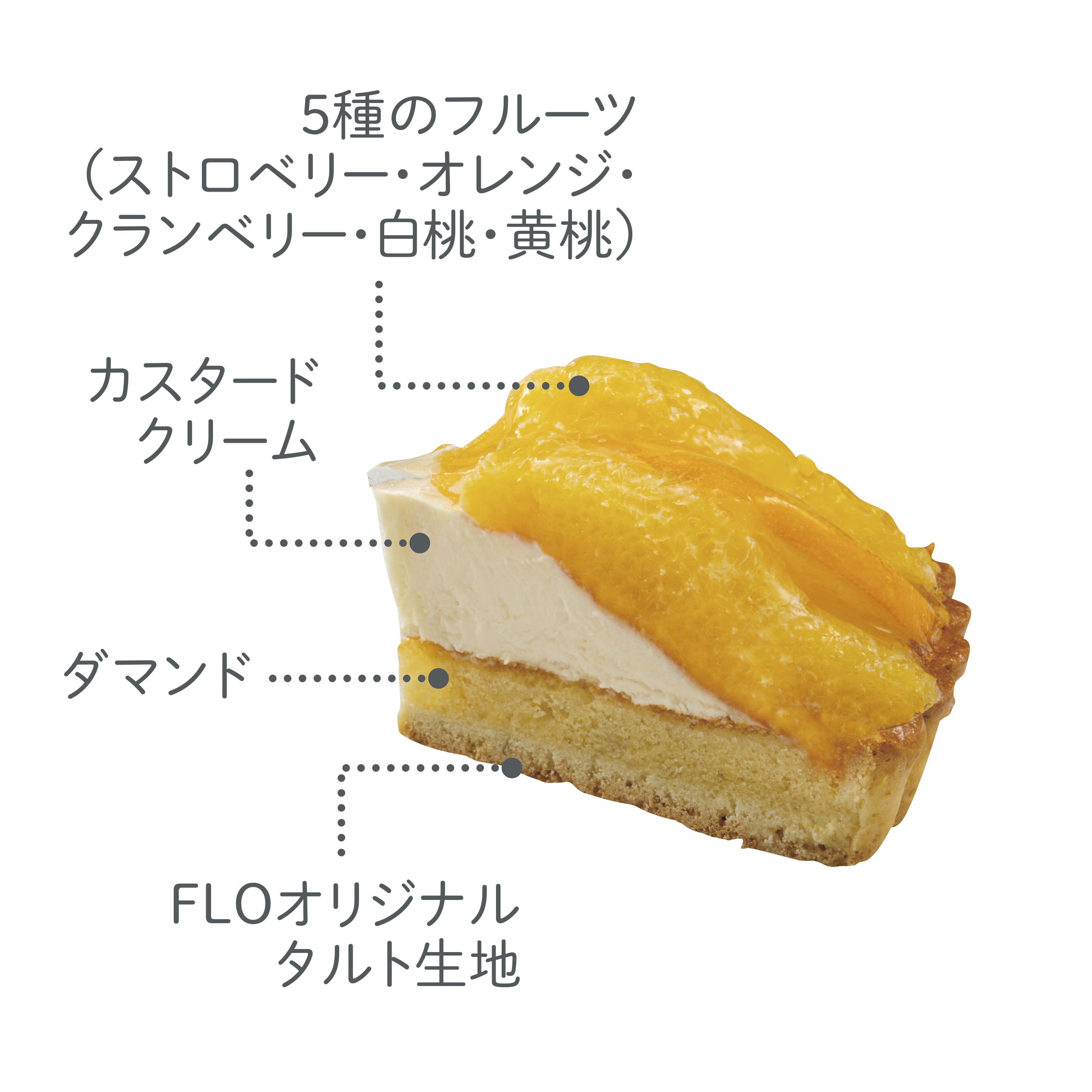 アーモンドパウダーを加え香ばしく焼き上げたサクサク食感のタルト生地の上に、カスタードクリーム、色とりどりの5種のフルーツを盛り付けた煌びやかなフルーツタルト。