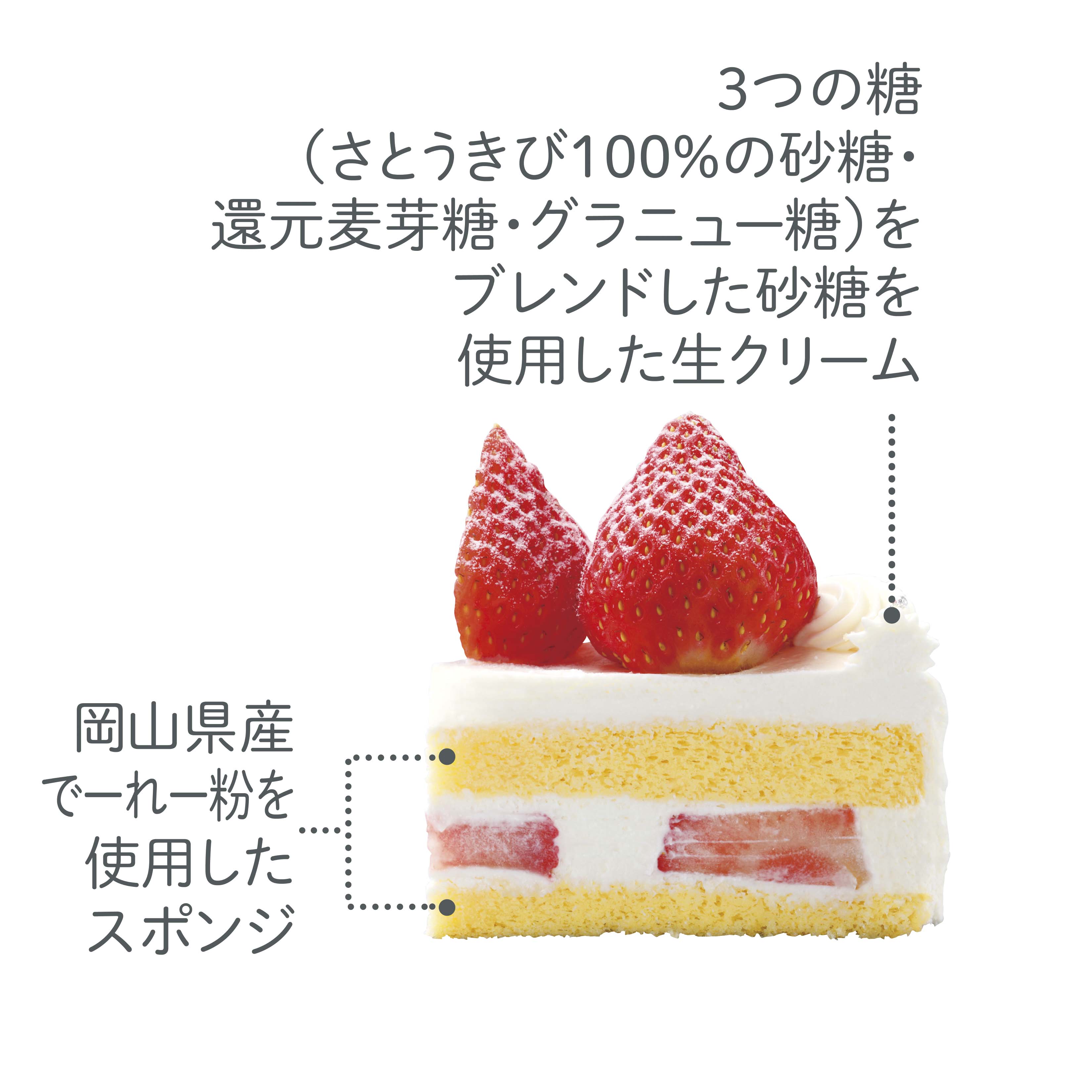 生クリームにさとうきび100%の砂糖や還元麦芽糖を使用。スポンジには岡山県産の大麦を使用しています。