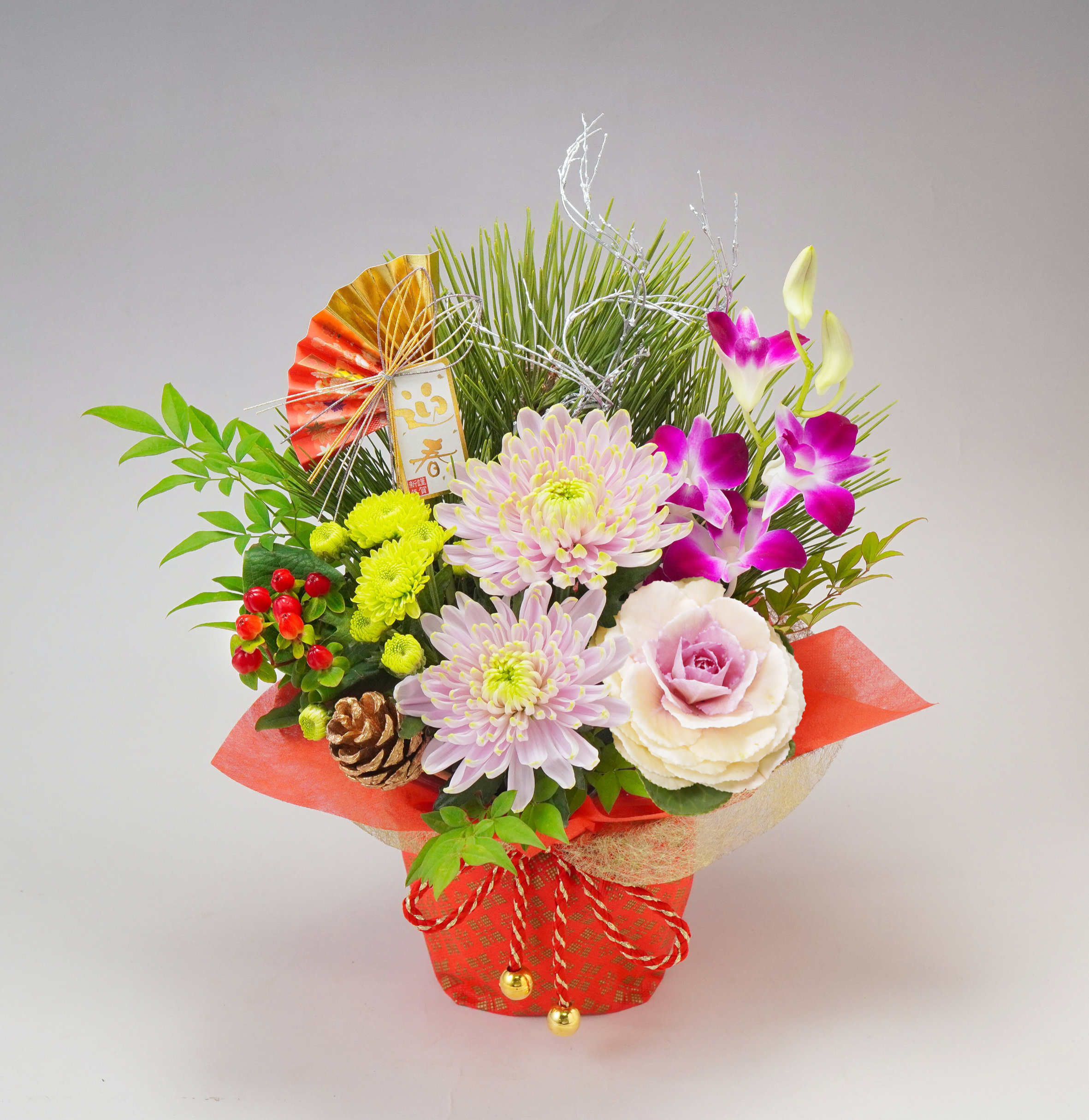 松、銀竹、デコラマム2、スプレーマム、デンファレ、ハボタン、ヒペリカム、扇ピック、松笠ピック