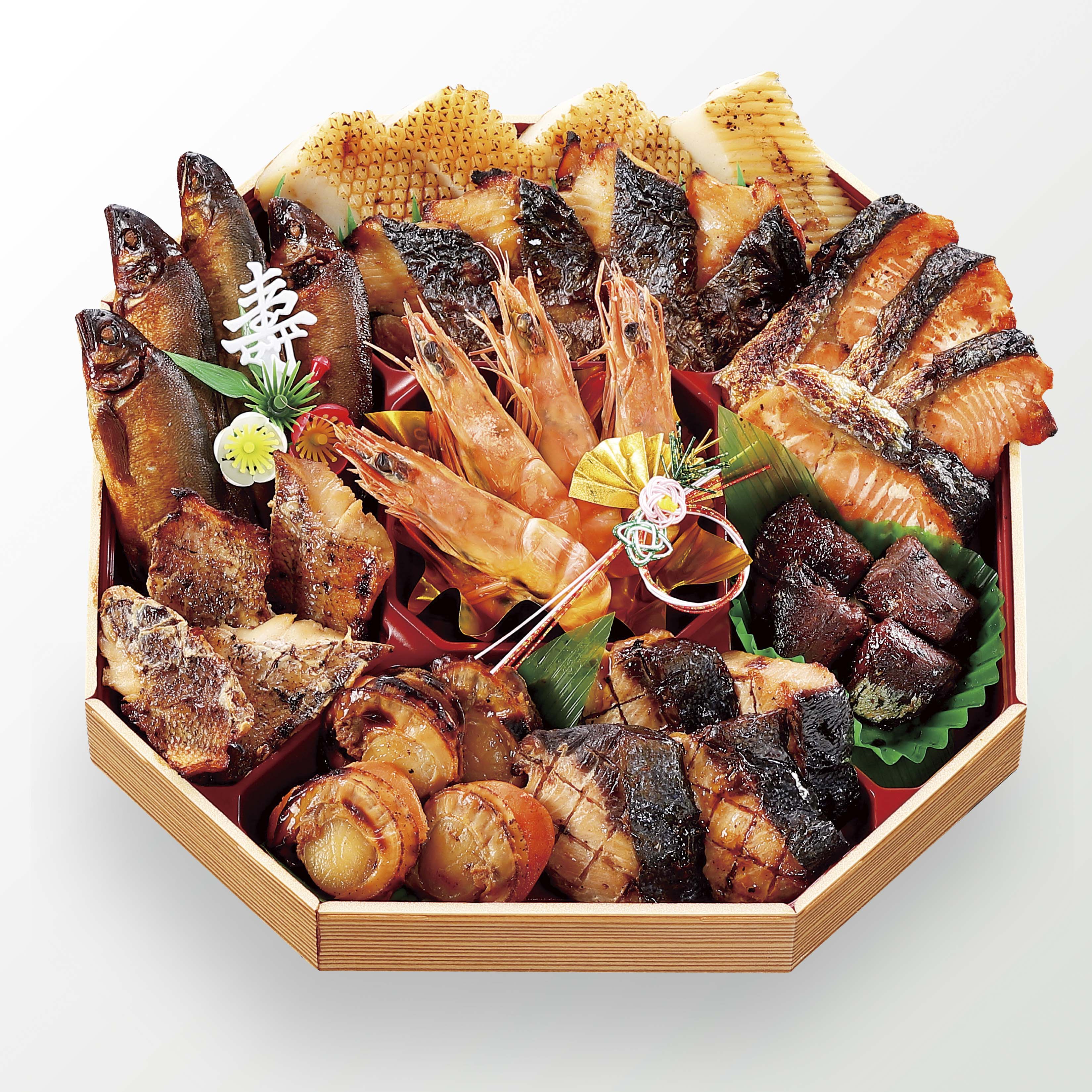 有頭海老煮、帆立照焼、鰤照焼、銀ヒラス照焼、鮭塩焼、赤魚照焼、いか照焼、鮎甘露煮、秋刀魚甘露煮