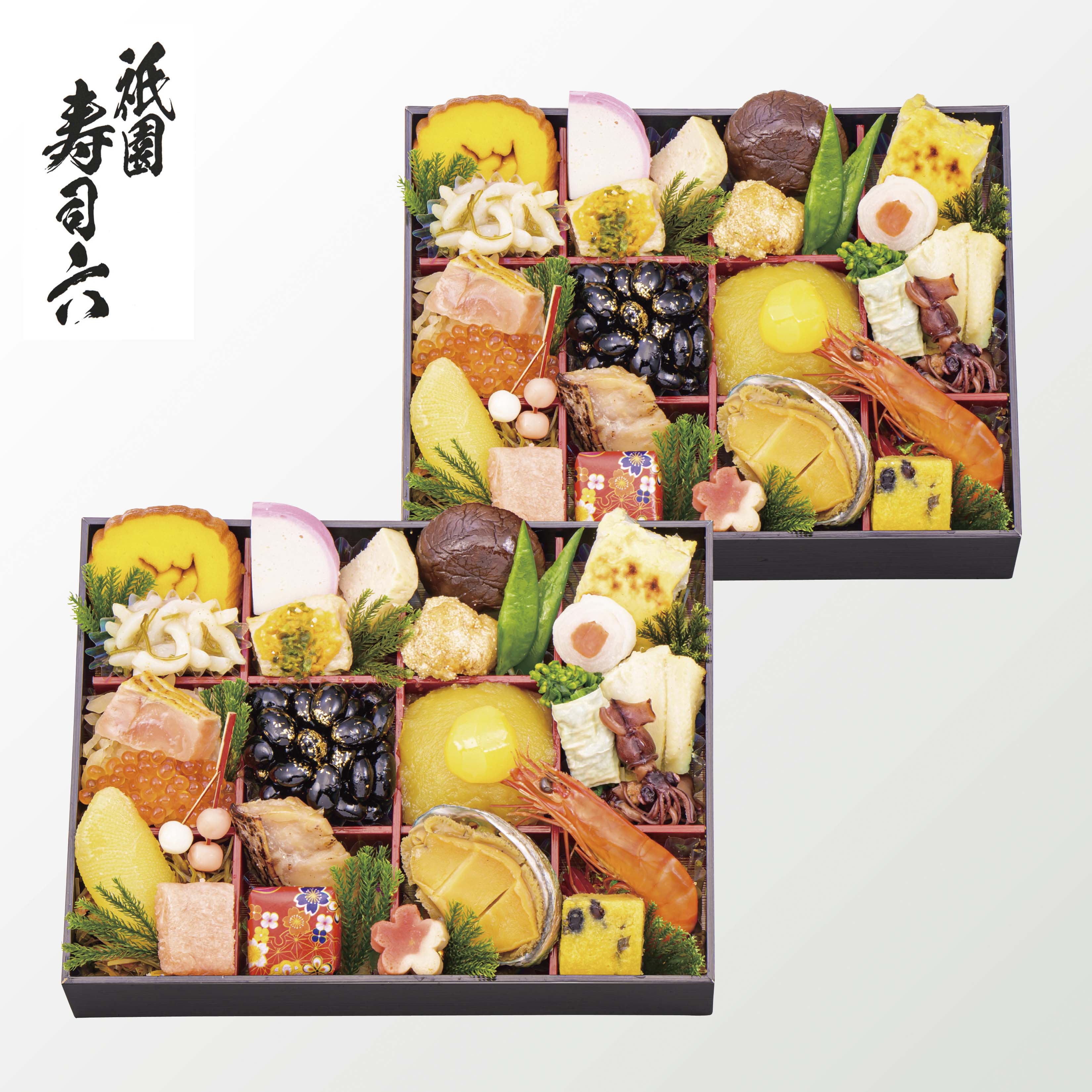 お二人で一緒に楽しめるように、同じ内容のお重を一組にしました。厳選した食材を使用し、華やかで上品な彩りに心を配り、新春の装いに仕上げた一段三十品目の贅沢なおせち。京料理の伝統に忠実に、祇園寿司六ならではの工夫も加えたこだわりの一品。一つずつ丁寧に仕上げた繊細な味わいをご堪能下さい。