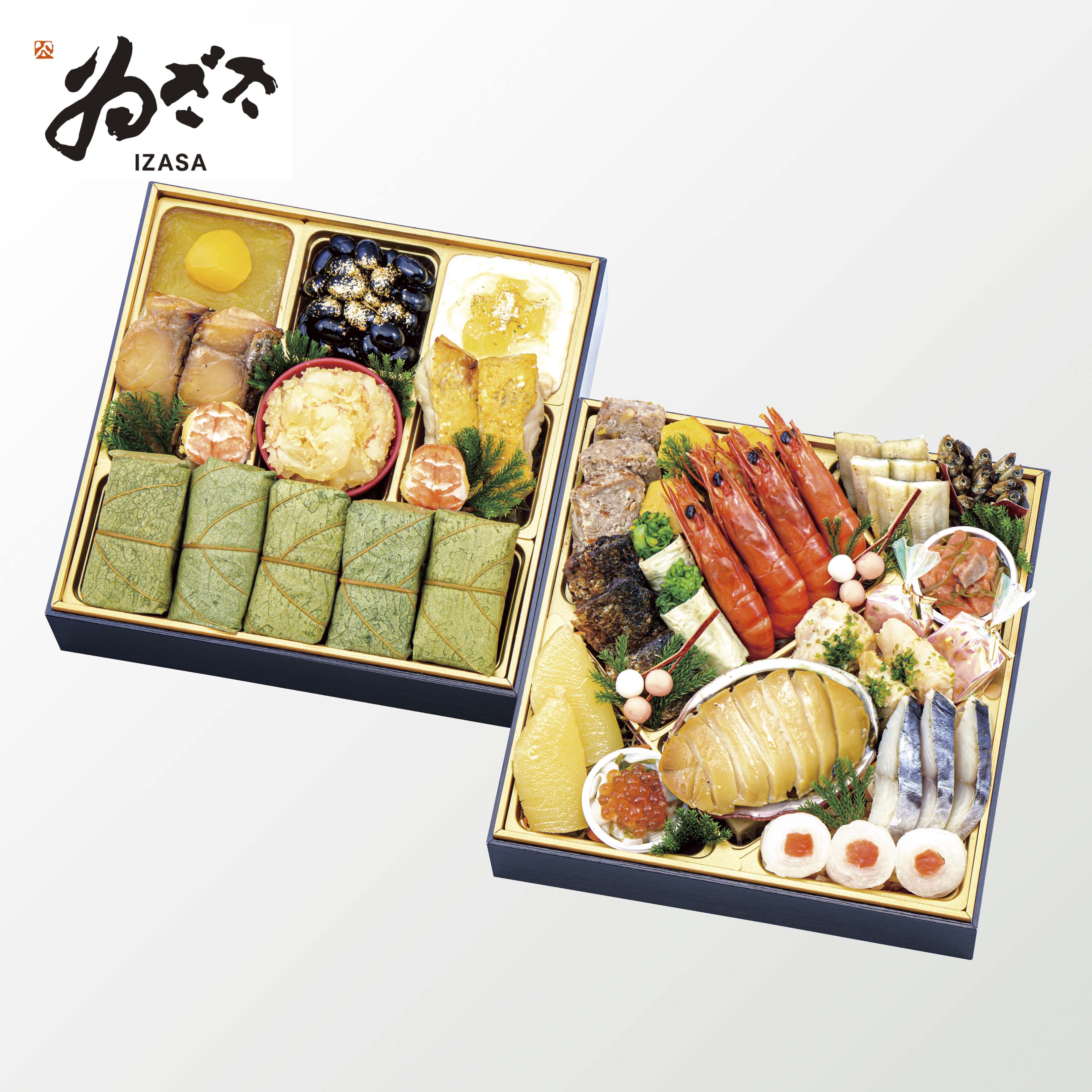 奈良の伝統料理「柿の葉寿司」をお正月に味わっていただけるように、温めてお召し上がりいただける「蒸し柿の葉寿司」としておせちと一緒に盛込みました。おせちとお寿司が一度に両方味わえる贅沢なおせち料理です。黒豆・数の子・海老・金団など縁起の良い由緒ある食材をしっかりと盛りこみました。彩り豊かなおせち料理で華やかなお正月を演出いたします。「蒸し柿の葉寿司」は加熱してお召し上がりください。