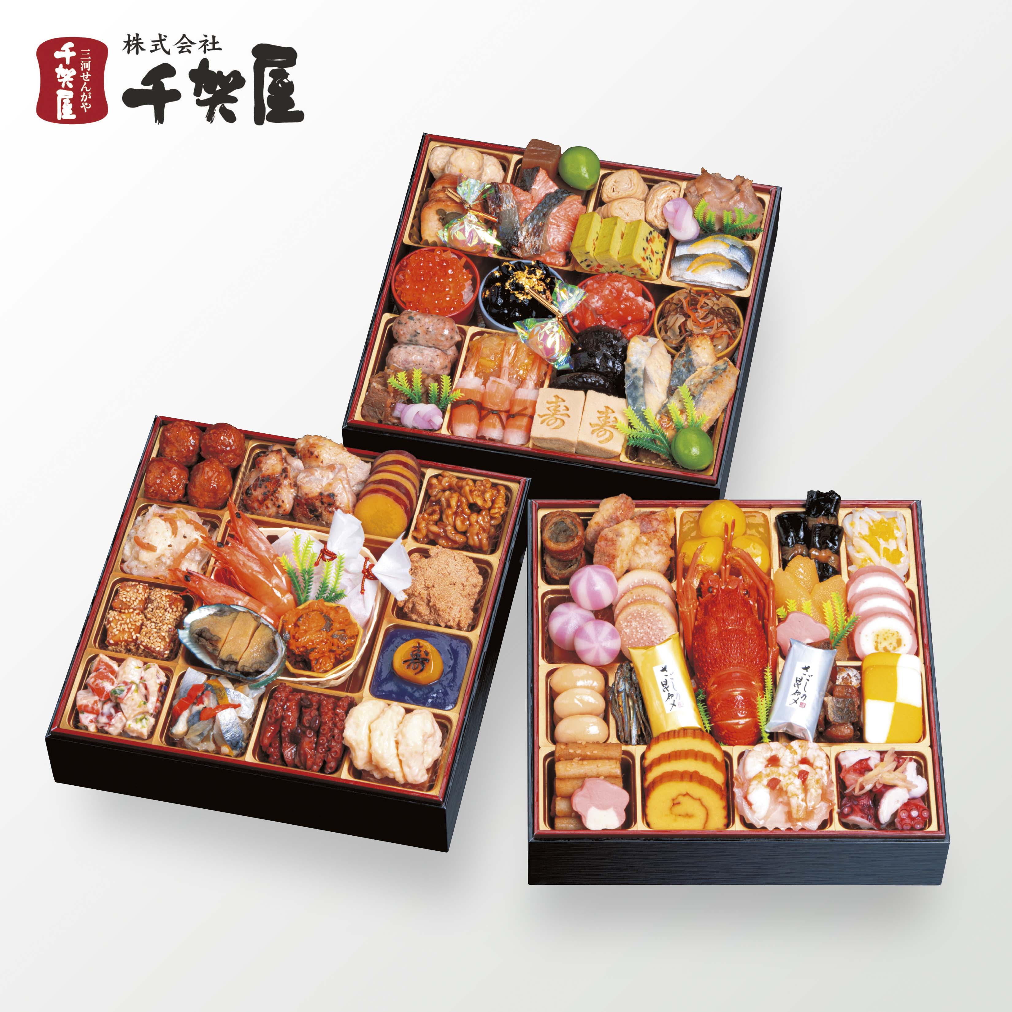 【三の重】柚子鶏つくね3個、鶏の三色巻3切、こんにゃく旨煮3個、紅鮭白醤油焼3切、若桃甘露煮2個、湯葉旨煮3個、新緑ふくさ3切、長寿貝の中華風18g、ままかり酢漬け柚子風味6枚、紅白結び餅2個、紅白なます20g、いくら醤油漬10g、金箔黒豆43g、紅鮭の石狩漬45g、松前漬37g、チーズインミート3個、牛肉ごぼう時雨煮24g、柚子くらげ28g、海老紅白奉書3個、椎茸旨煮3枚、寿高野豆腐2個、鰆西京焼3切、柚子オーロラ2個