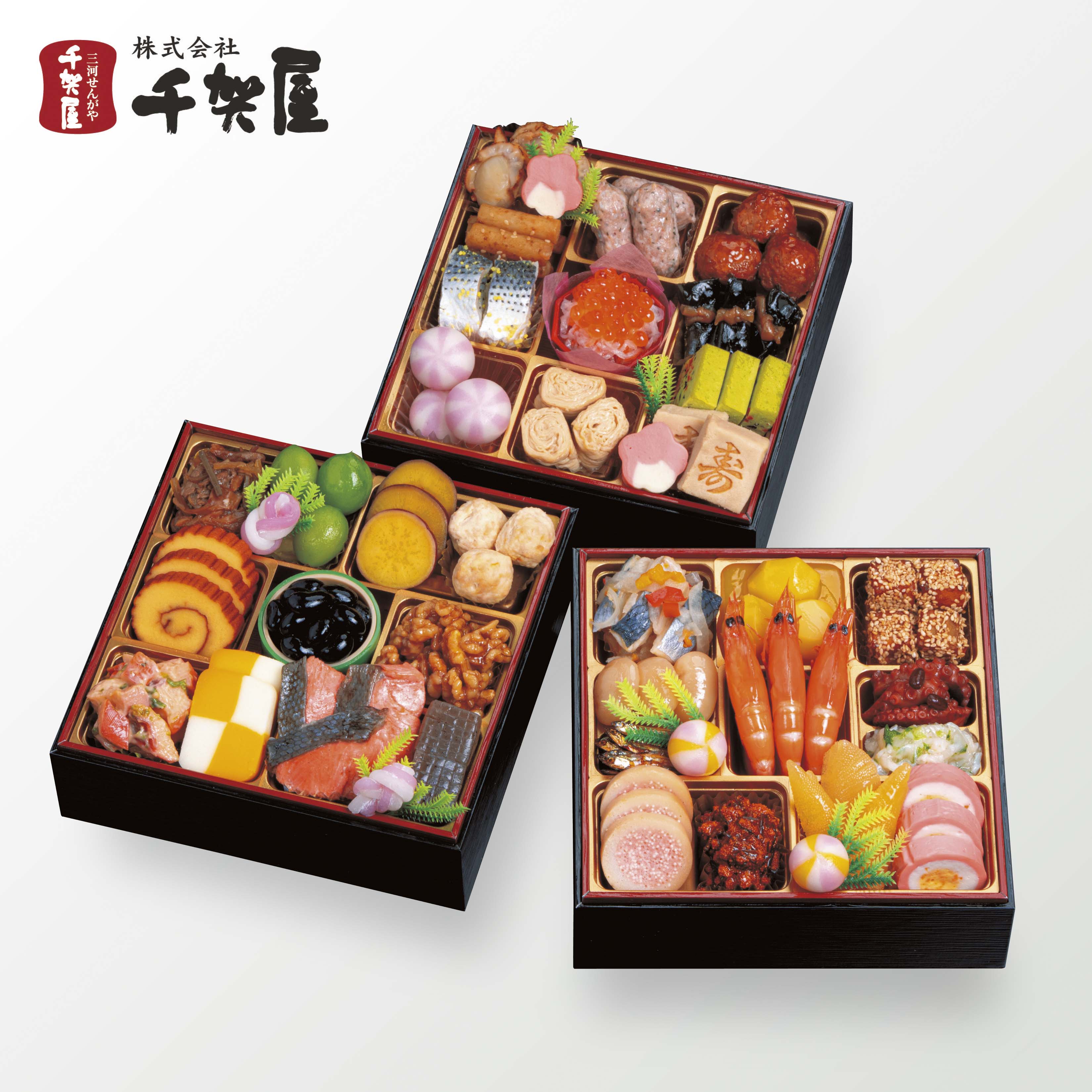 【三の重】焼き帆立3個、酢牛蒡6本、こはだ粟漬6枚、梅真丈2枚、チーズインミート3個、味付け肉団子3個、紅白なます20g、いくら醤油漬8g、昆布巻3個、新緑ふくさ3切、寿高野豆腐2個、手毬餅まんじゅう3個、湯葉旨煮3個
