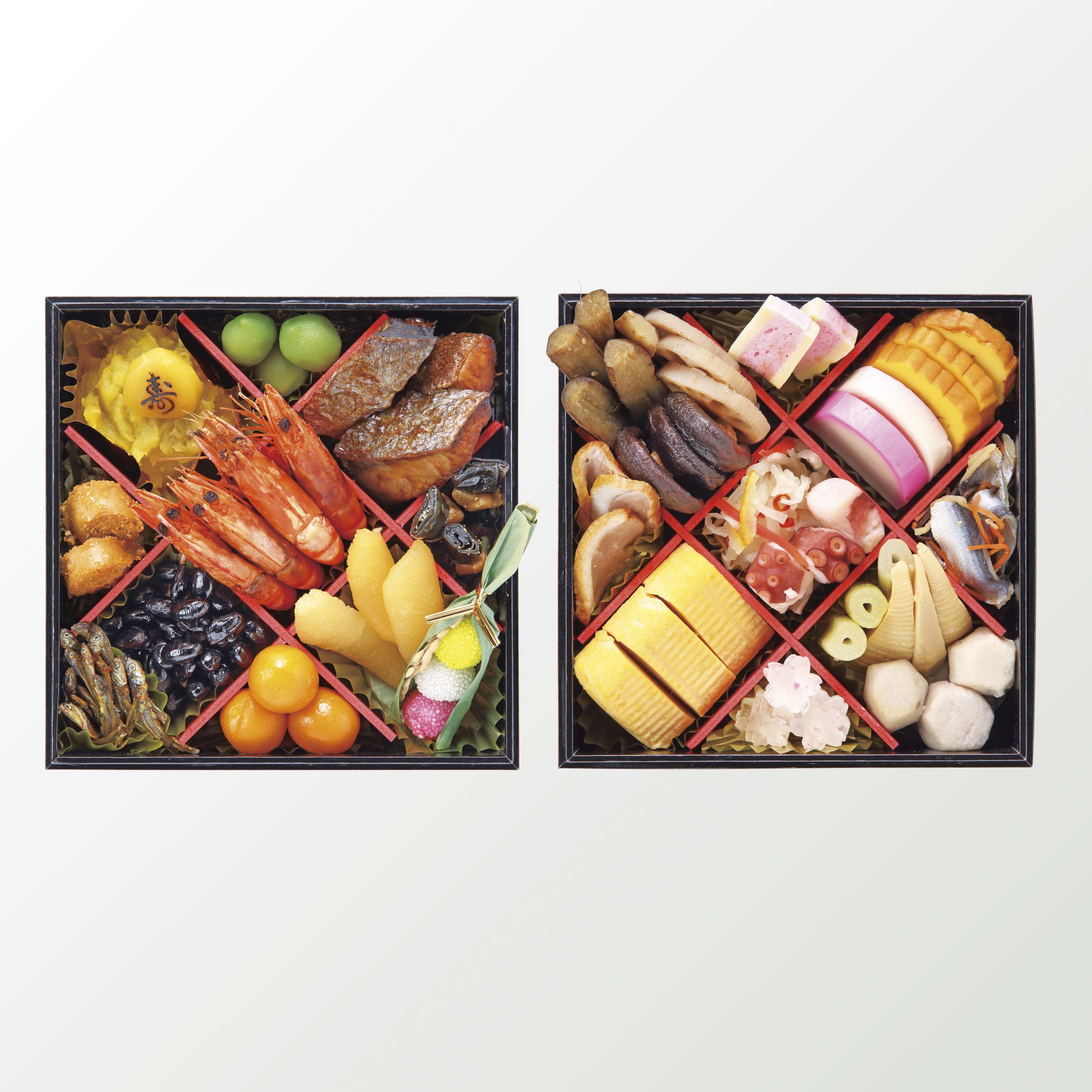 【一の重】岡山県産さつまいものきんとん、寿焼印栗甘露煮、若桃の甘露煮、厚切ぶりの照焼、にしん入り昆布巻、海老煮、ソフトたらっこ、田作り、岡山県産作州黒の甘煮、金柑、かずのこ、豊年団子